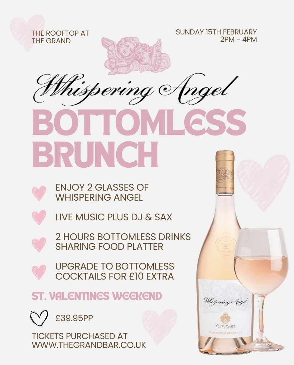 Join us on The Rooftop on Sunday 15th February for our Whispering Angel Bottomless Brunch! Receive 2 glasses of Whispering Angel followed by 2 hours of bottomless drinks, food and live entertainment! All for just £39.95 per person! You can also upgrade to bottomless cocktails for just £10!